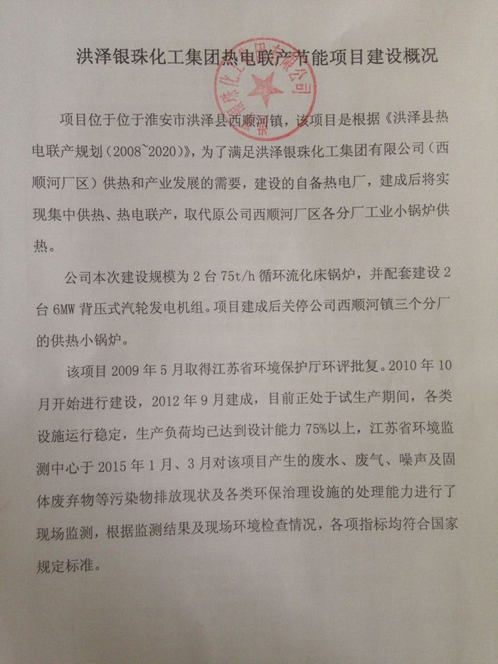 洪澤銀珠化工集團(tuán)熱電聯(lián)產(chǎn)節(jié)能項(xiàng)目建設(shè)慨況及環(huán)保執(zhí)行情況公示(附監(jiān)測(cè)報(bào)告)