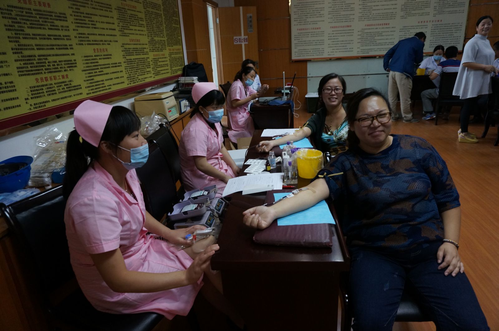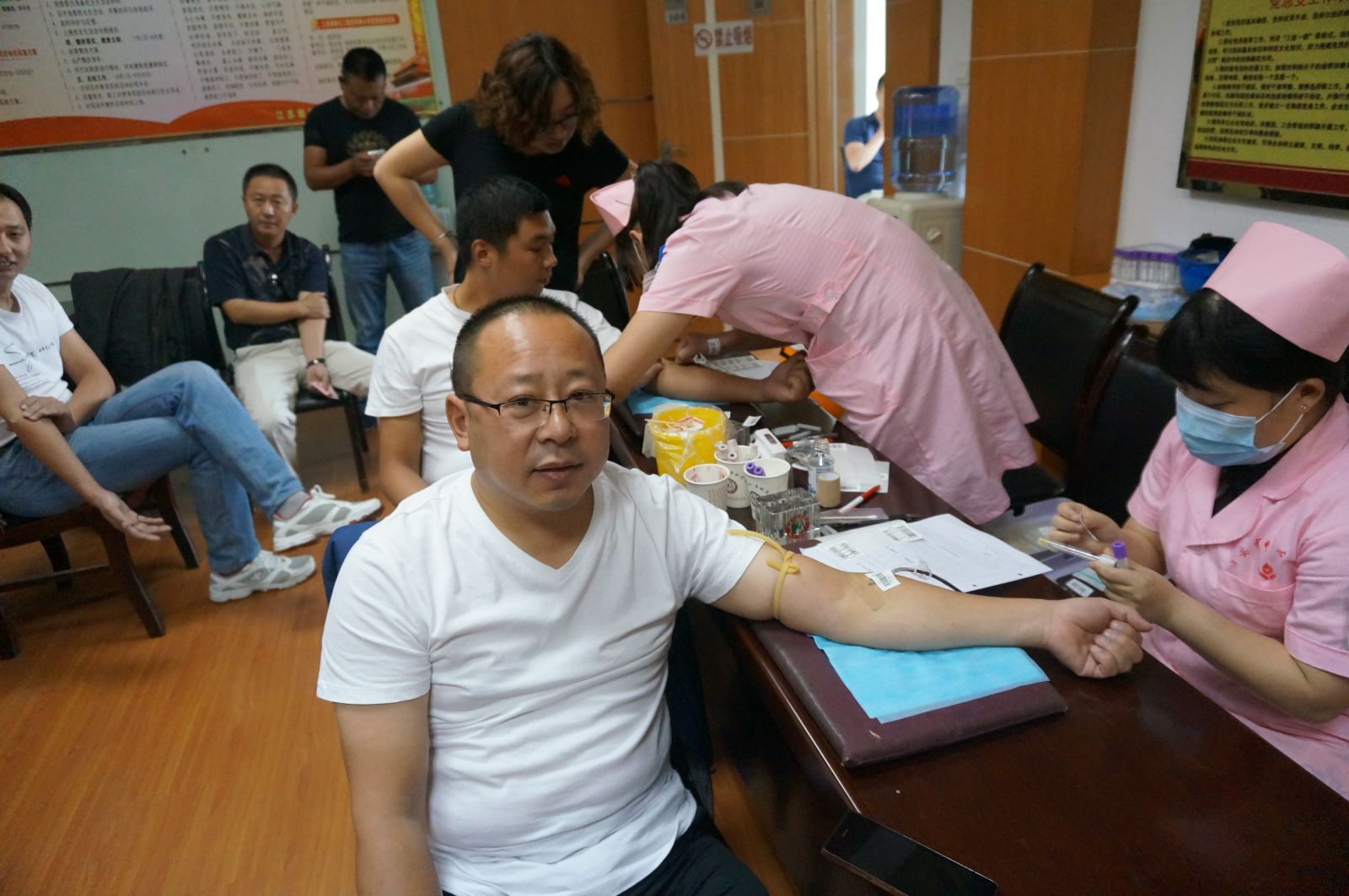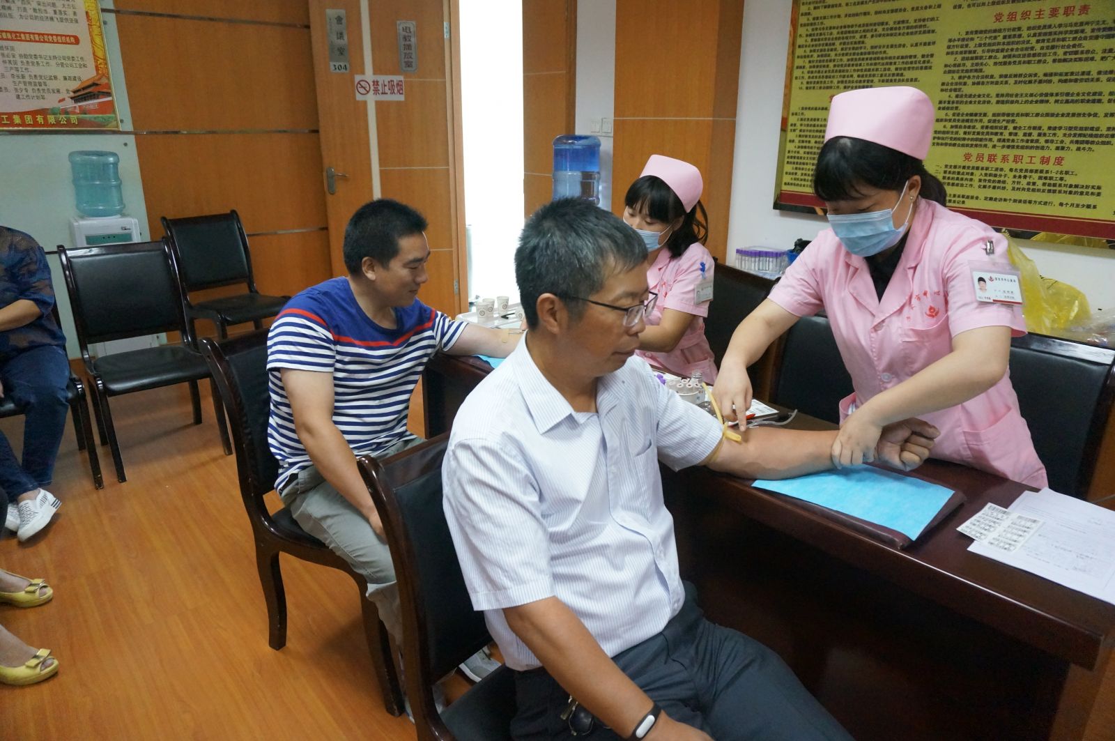 9月22日上午8點,在公司3樓會議室,我公司工會組織廣大職工參與義務獻血活動,在公司領導的帶頭下,共有30余名職工積極參與此次活動。在活動現場,我公司的領導和職工在認真填寫了義務獻血登記表,經過化驗血型、量血壓等程序后,檢查合格者積極配合工作人員,挽起衣袖,勇敢地伸出自己的胳膊。大家都為能夠參加這次活動感到光榮和自豪。