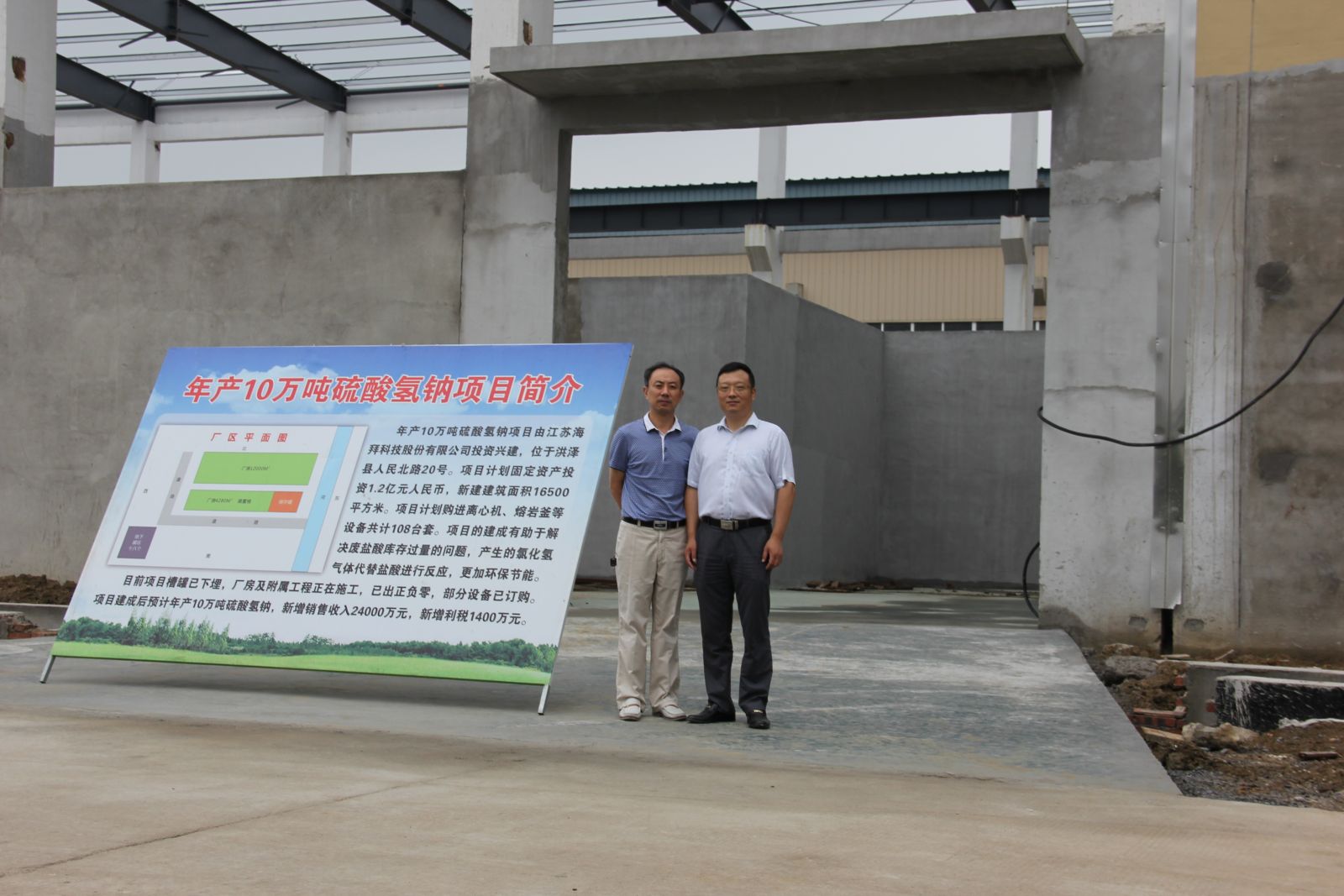 8月12日上午,區委朱亞文書記一行來我公司調研在建年產10萬噸硫酸氫鈉項目,集團公司李林總經理,海拜科技仲其國董事長、盧愛萍總經理陪同調研。在施工現場,仲其國董事長向朱書記介紹了在建項目的進度。朱書記強調,要保證項目質量,確保施工安全。同時,朱書記希望企業能夠抓住市場機遇,進一步加快項目建設進度,爭取早日建成投產。