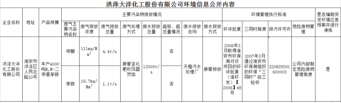 洪澤大洋化工股份有限公司環境信息公開內容