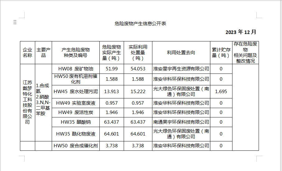 戴夢特2023年12月危險廢物產生信息公開表